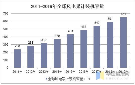 得益于技术进步和商业模式创新,风能行业正在快速发展,2019年全球新增风电装机容量60.4GW,较2018年增长了19%,是风电历史上增幅第二高的年份。其中陆上风电新增装机容量54.3GW,海上风电为6.1GW。截至2019年底,全球风电累计装机容量达到651GW。